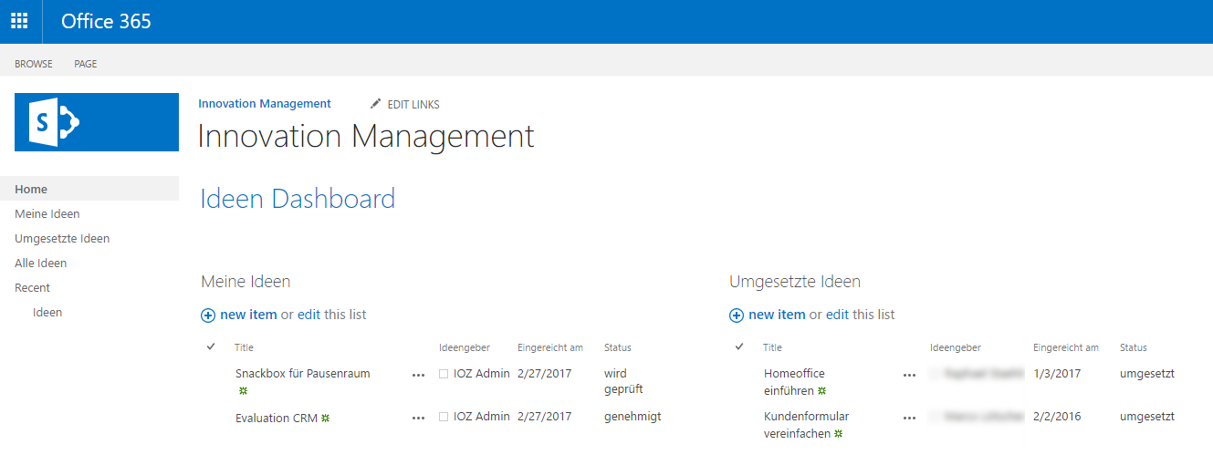 Ansichten in SharePoint erlauben es, die Daten bereits sortiert und gefiltert darzustellen. So müssen die Anwender nicht immer dieselben Schritte erneut machen, sondern erhalten direkt mit einem Klick, was sie suchen. Im Beispiel werden die realisierten Ideen sinnvoller Weise für das gesamte Unternehmen in einer solchen Ansicht angezeigt. Der Ideengeber selbst möchte zudem jederzeit den Status seiner Ideen anzeigen können, egal ob diese abgelehnt oder bewilligt wurde – er erhält auch hierzu eine entsprechend konfigurierte Ansicht.