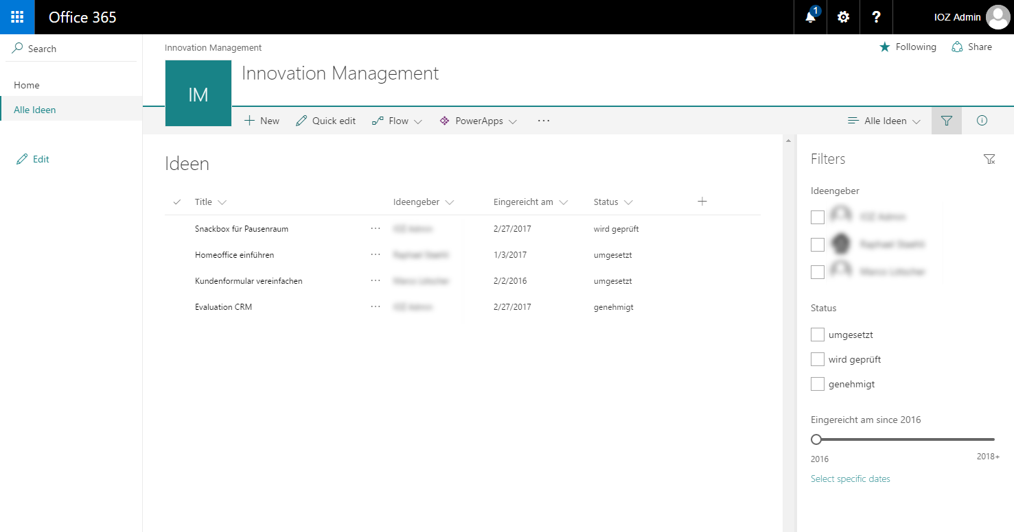 Die zuständigen Personen, welche die Ideen beurteilen, müssen die eingereichten Ideen aller Mitarbeitenden sehen können. Diese Berechtigungen können dank SharePoint einfach implementiert werden und die gewünschten Datensätze entsprechend gezielt angezeigt werden. Dazu stehen Listen-Filter zur Verfügung, welche im aufgeräumten, neuen Design «Modern UI» in SharePoint Online so aussehen kann: